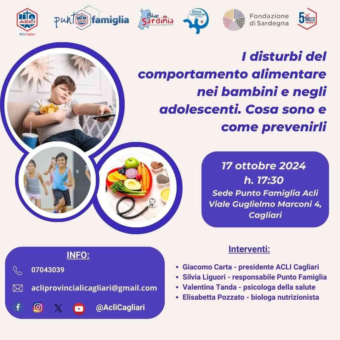 Anoressia, Bulimia, Alimentazione incontrollata. Sono fenomeni allarmanti, sempre più diffusi tra i giovani. Il Punto Famiglia delle ACLI di Cagliari, in collaborazione con Blue Sardinia ASD e Bene Comune Sardegna, organizza il seminario “Disturbi del Comportamento Alimentare nei Bambini e negli Adolescenti: Cosa sono e come prevenirli“. L’appuntamento è per il prossimo 17 ottobre, a partire dalle ore 17:30, nella sede provinciale delle ACLI di viale Marconi, 4 a Cagliari.