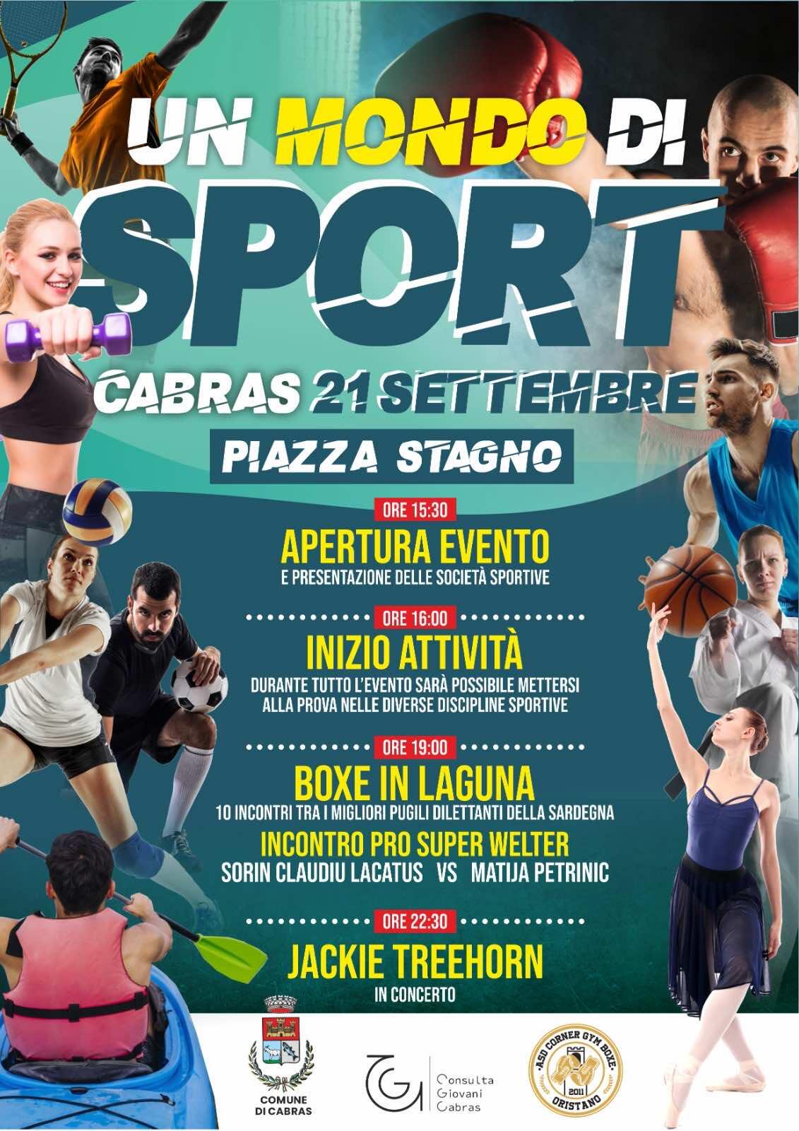 “Un mondo di sport è un grande contenitore all’interno del quale ci si potrà confrontare a tutto tondo con le arti corporee e lo sport. Nasce con l’obiettivo incentivare la pratica sportiva e valorizzare tutti i nostri atleti e le società sportive del territorio. Cabras ha la fortuna di avere numerosi sportivi che ogni anno raggiungono risultati importanti in varie discipline, dalla canoa, al calcio, alle arti marziali e alla danza. Siamo orgogliosi dei loro successi – afferma l’Assessore allo Sport Carlo Trincas -. La nostra cittadina si mostra ancora una volta come centro di attrazione importante sotto il profilo turistico, quale generatore di molteplici appuntamenti capaci di richiamare un pubblico di volta in volta nuovo”.