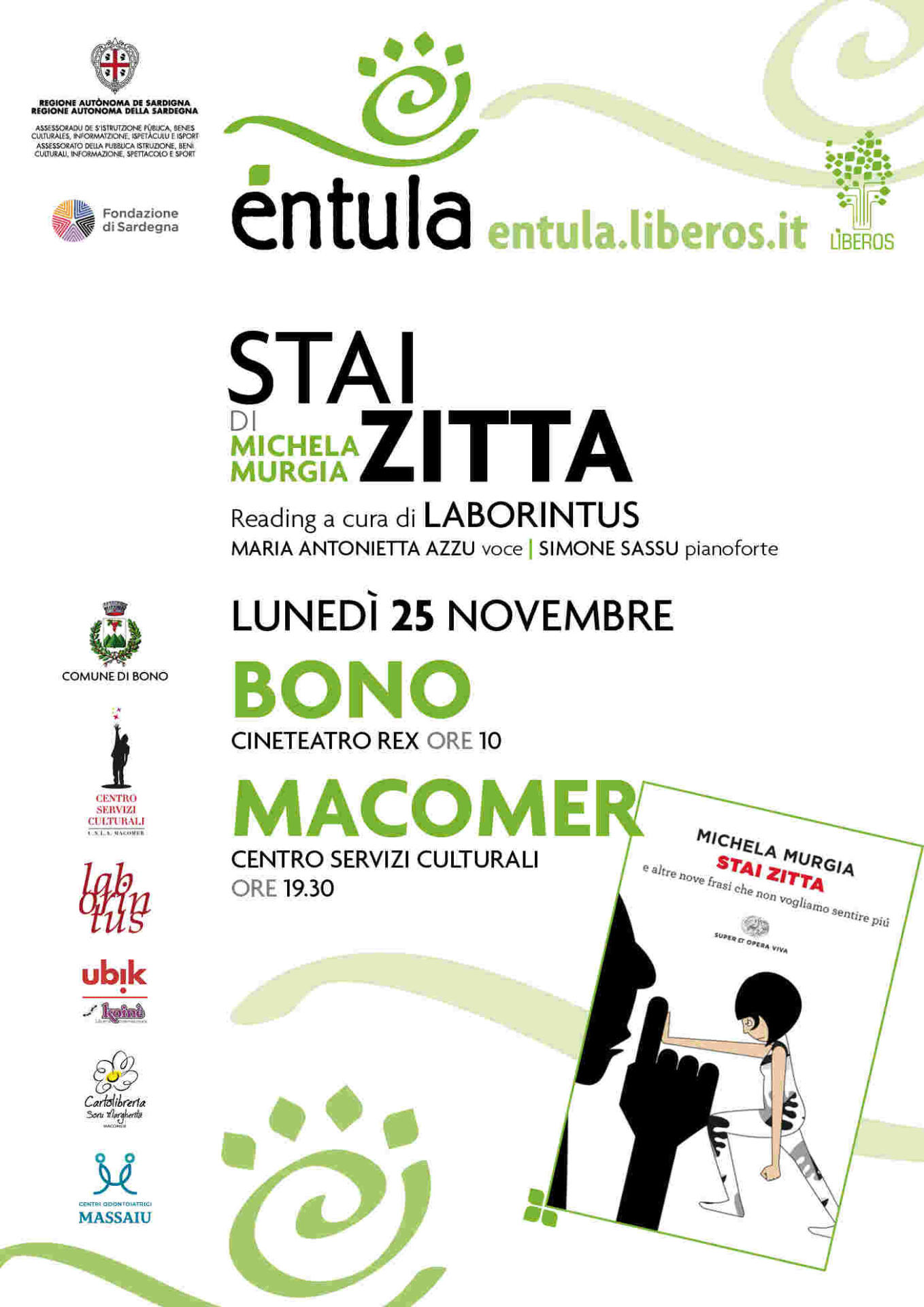 Lunedì 25 novembre, in occasione della Giornata internazionale per l’eliminazione della violenza contro le donne, a Bono e Macomer si porterà all’attenzione del pubblico un reading, curato da Laborintus, tratto dal libro di Michela Murgia “Stai zitta” (Einaudi)