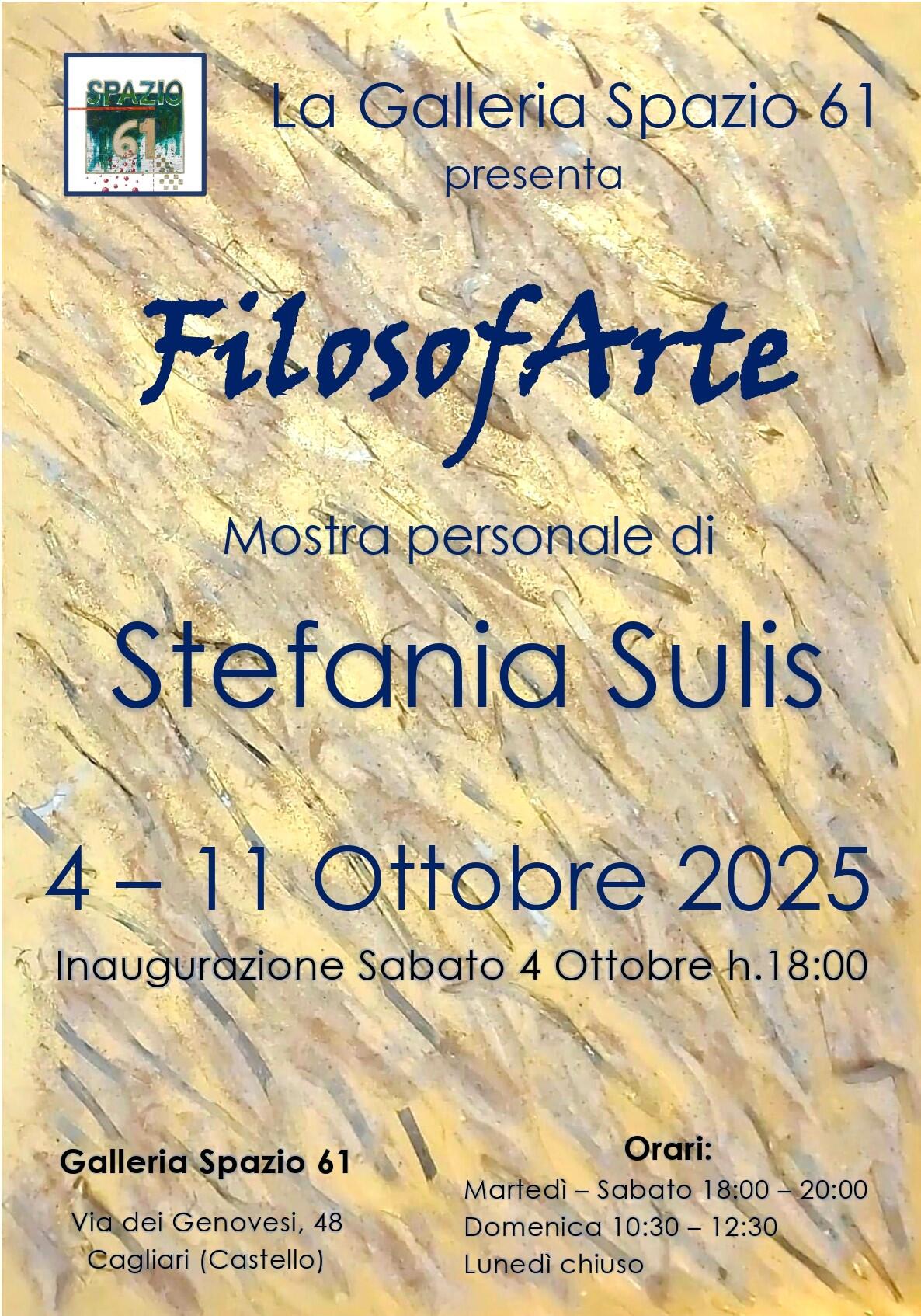 Da Sabato 4 Ottobre 2025 (giorno della inaugurazione, h. 18.30), la Galleria Spazio 61 ospita “FilosofArte“, la mostra personale dell’artista Stefania Sulis. Rimarrà aperta sino al giorno di Sabato 11 Ottobre c.a..