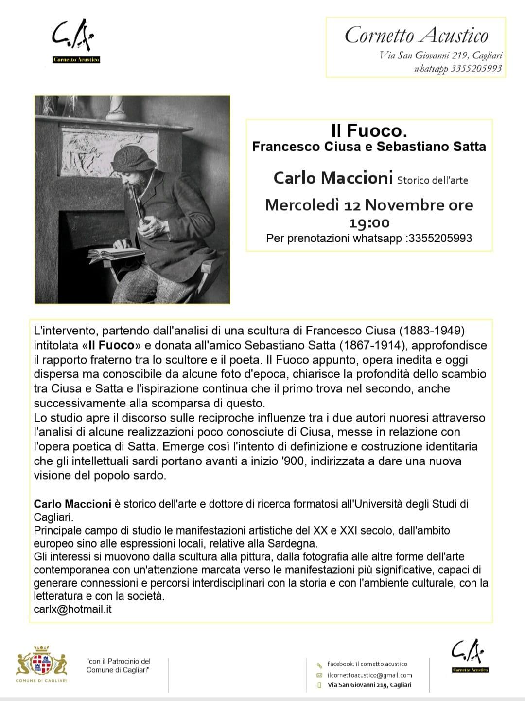 “IL FUOCO” – Conferenza di Carlo MACCIONI su Francesco CIUSA e Sebastiano SATTA al “Cornetto Acustico” di Cagliari