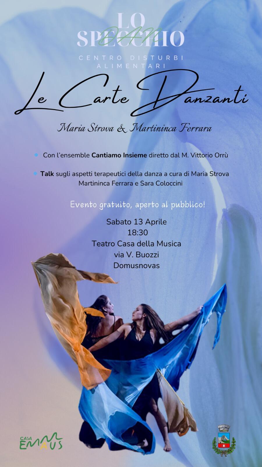 L’inimitabile performance di danza realizzata da Maria Strova, e da sua figlia Martinica Ferrara, sarà a disposizione libera e gratuita per il pubblico che seguirà “Le carte danzanti”, lo spettacolo in programma sabato 13 aprile, alle 18.30, al Teatro di Domusnovas in via Buozzi. Si tratterà del coronamento di un weekend che vedrà le due danzatrici e coreografe, conosciute a livello internazionale, ospiti de Lo Specchio DAN, il Centro per i disturbi dell’alimentazione e della nutrizione situato a Domusnovas. Le ospiti della struttura parteciperanno allo spettacolo con l’ensemble “Cantiamo insieme”, dirette dal maestro Vittorio Orrù; chiuderà la serata un talk sugli aspetti terapeutici della danza a cura di Maria Strova, Martinica Ferrara e dalla dottoressa Sara Coloccini, psichiatra de Lo Specchio Dan. Le ospiti parteciperanno inoltre a due seminari tra sabato e domenica, “Il respiro del velo” e “Il gioco delle carte danzanti”.