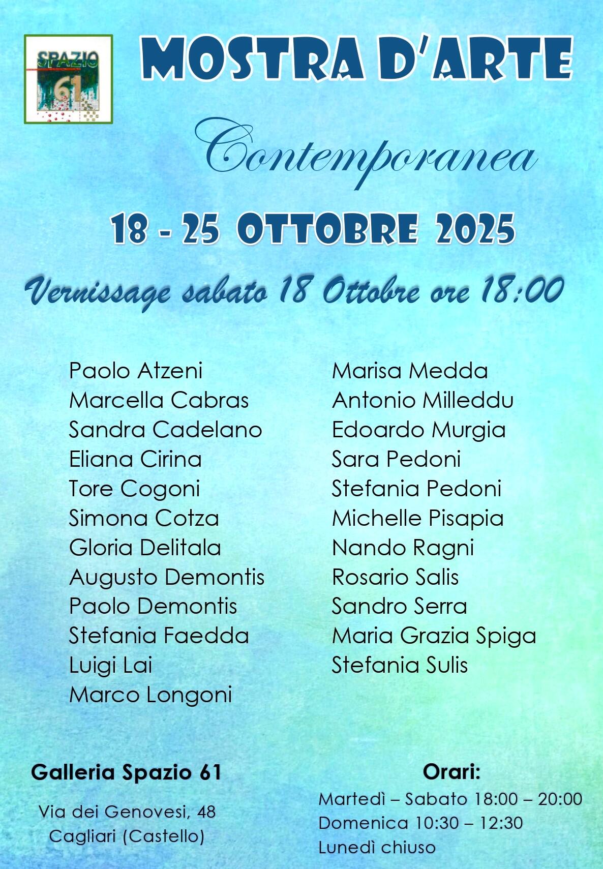 Conclusa la mostra “FilosofArte” di Stefania Sulis, l’attività della Galleria “Spazio 61” continua con la Mostra Collettiva d’Arte Contemporanea, che sarà inaugurata sabato 18 ottobre alle ore 18:00, nella sede di via dei Genovesi n. 48 a Cagliari (quartiere storico di Castello).