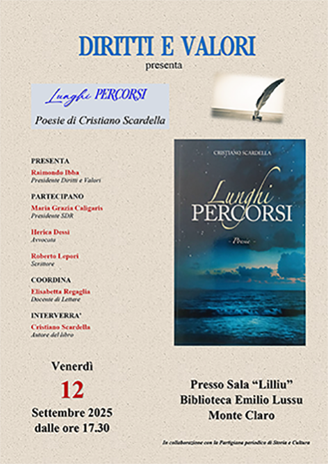 Venerdì 12 settembre 2025, dalle ore 17.30, nello spazio della sala “LILLIU” c/o la Biblioteca “Emilio LUSSU” a Monte Claro a Cagliari (con ingresso da via Cadello o via Mattei), l’associazione “Diritti e Valori” presenterà la raccolta auto-prodotta di poesie di Cristiano SCARDELLA, intitolata “Lunghi Percorsi”.
