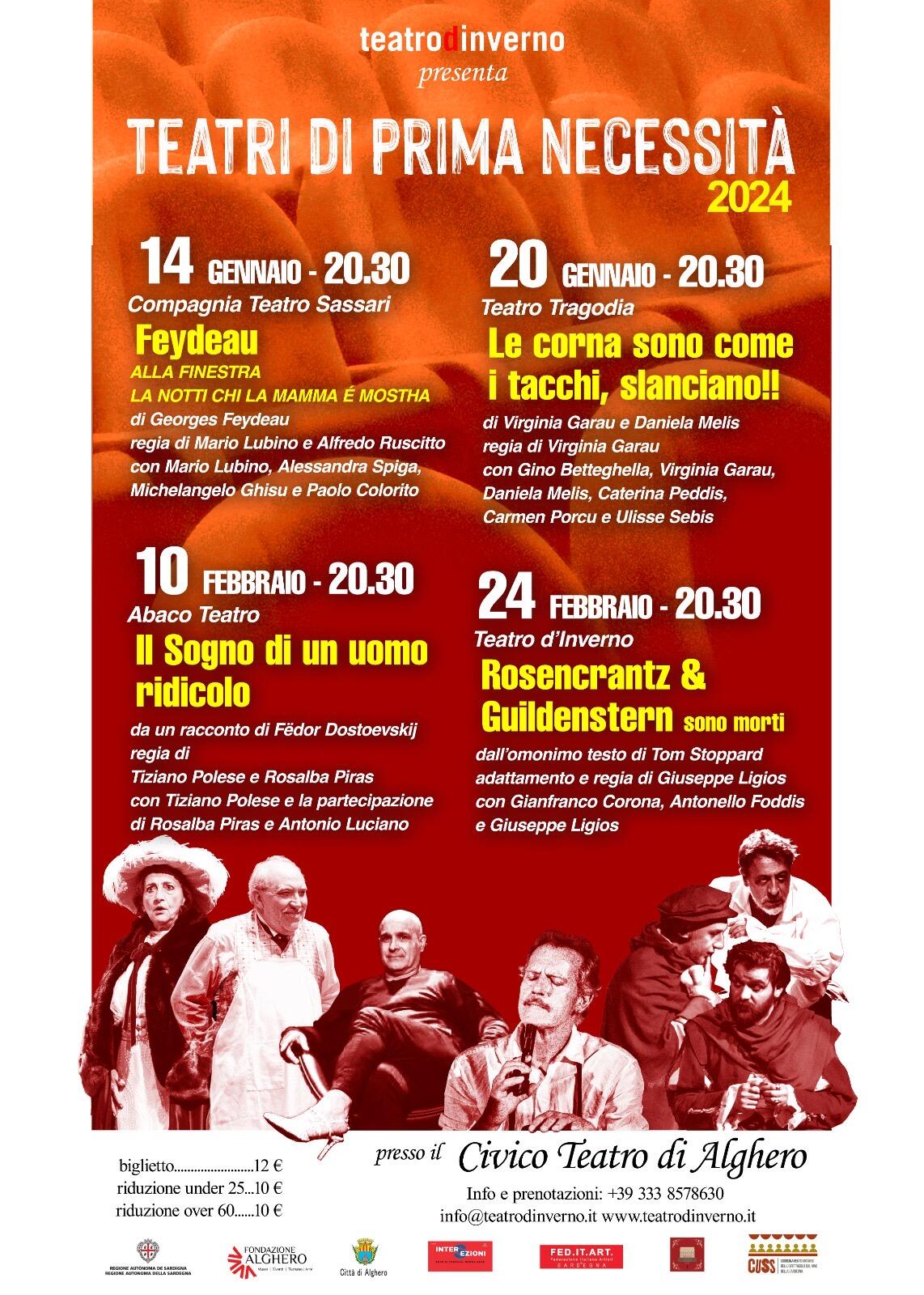 Dal 14 gennaio 2024 al Civico Teatro “Gav Ballero” di Alghero riparte ì Teatri di Prima Necessità. Quattro gli appuntamenti in cartellone nella la rassegna organizzata dalla Compagnia Teatro d’Inverno con la direzione artistica di Giuseppe Ligios e realizzata con il patrocinio della Fondazione Alghero [M.E.T.A.], del Comune di Alghero e il contributo della Regione Autonoma della Sardegna _ Assessorato della Pubblica Istruzione, Beni Culturali, Informazione Spettacolo e Sport. La nuova stagione di prosa si apre domenica 14 alle ore 20:30 con due commedie in atto unico presentate dalla storica Compagnia Teatro Sassari, una doppietta tratta dal lavoro del regista e drammaturgo francese Georges Feydeau: “Dalla finestra” diretto da Mario Lubino, che ne anche interprete insieme ad Alessandra è Spiga, e “La mamma buonanima della signora” per la regia di Alfredo Ruscitto su adattamento di Mario Lubino anche qui interprete con Alessandra Spiga, Michelangelo Ghisu e Paolo Colorito.