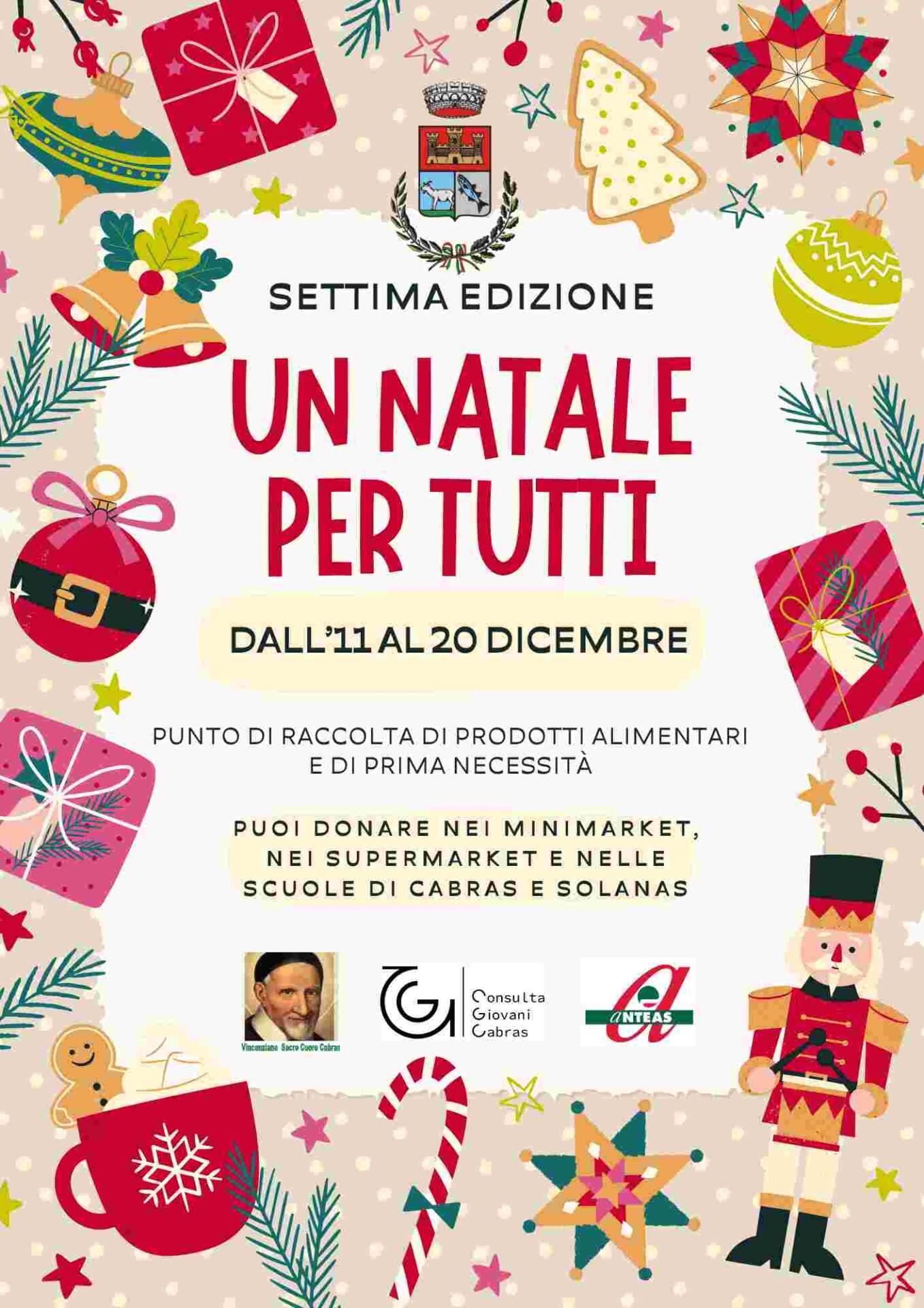 A partire da mercoledì 11 e fino a venerdì 20 dicembre, sarà possibile dare il proprio contributo attraverso l’acquisto di generi alimentari e prodotti di prima necessità presso i supermercati e i minimarket del paese. Saranno presenti dei banchetti di raccolta anche all’interno dei plessi dell’Istituto Comprensivo di Cabras e Solanas.